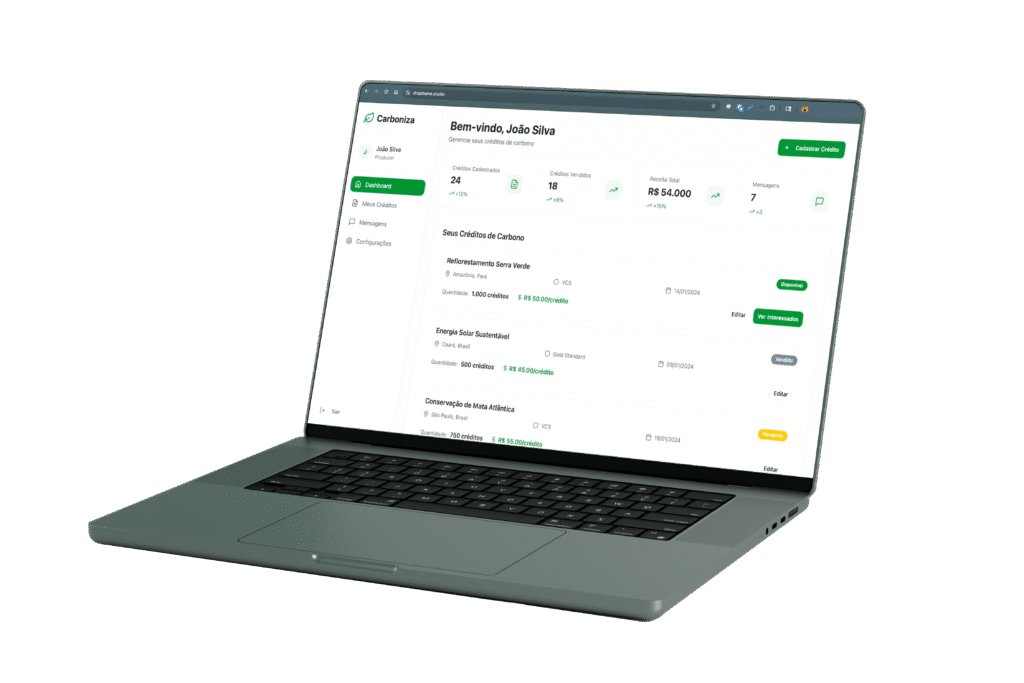 Estamos desenvolvendo uma interface intuitiva que tornará a compra e venda de créditos de carbono tão simples quanto fazer uma compra online.